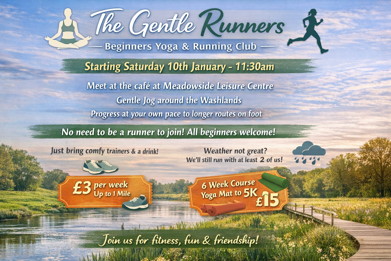 Our £3 weekly sessions offer a gentle introduction to running, starting with simple yoga-based warm-ups before an easy run of up to one mile (around 30–40 minutes). There’s no pressure on pace or time — this group is all about support, confidence, and steady progress.