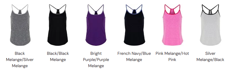 Wicking fabric. Scoop neck. Flattering cut for the female figure. Contrast spaghetti straps, racer back.